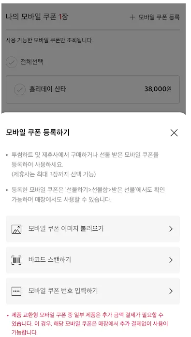 - 모바일 쿠폰 등록을 진행합니다. 등록 방법은 세 가지가 있습니다.